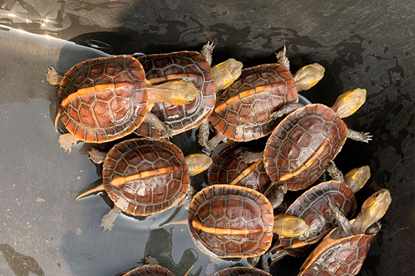 黄缘闭壳龟龟苗出壳后,大家都知道要先收好肚脐,也就是吸收好蛋黄中的营养。很多龟友可能看过我们的孵化室,我们孵化室周围都没有窗户的,关上门之后,里面基本上是一个纯黑的状态。那为什么要维持这样一个状态呢?就是说黄缘闭壳龟出壳了,因为黄缘闭壳龟有一个特性,就是说它苗子出来之后,在那个强光的刺激下,它会变得很活跃。他如果活跃的话,苗子就会乱动或者乱爬,它很容易就是说破坏掉它那个未吸收完的蛋黄。所以我们保持纯黑的环境避免光线,一般要维持个7到10天,才会把它们拿出来。黄缘闭壳龟还有一个特性,就是黑暗的时候它是往下面转的。它出壳了之后,它是往下面钻的,它不会跑出来的,它会呆在下面。只要我们维持维护好环境的温湿度,基本上就不会出问题。等它烧好肚脐,然后再把它们拿出来拿到外面来。